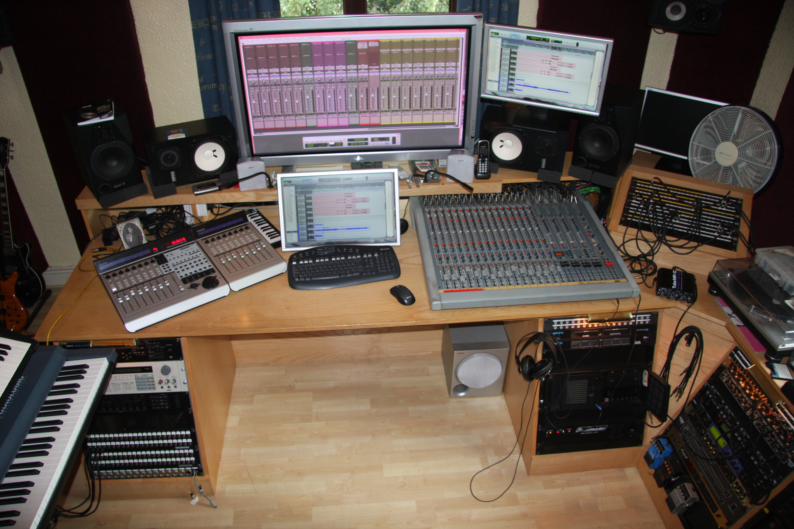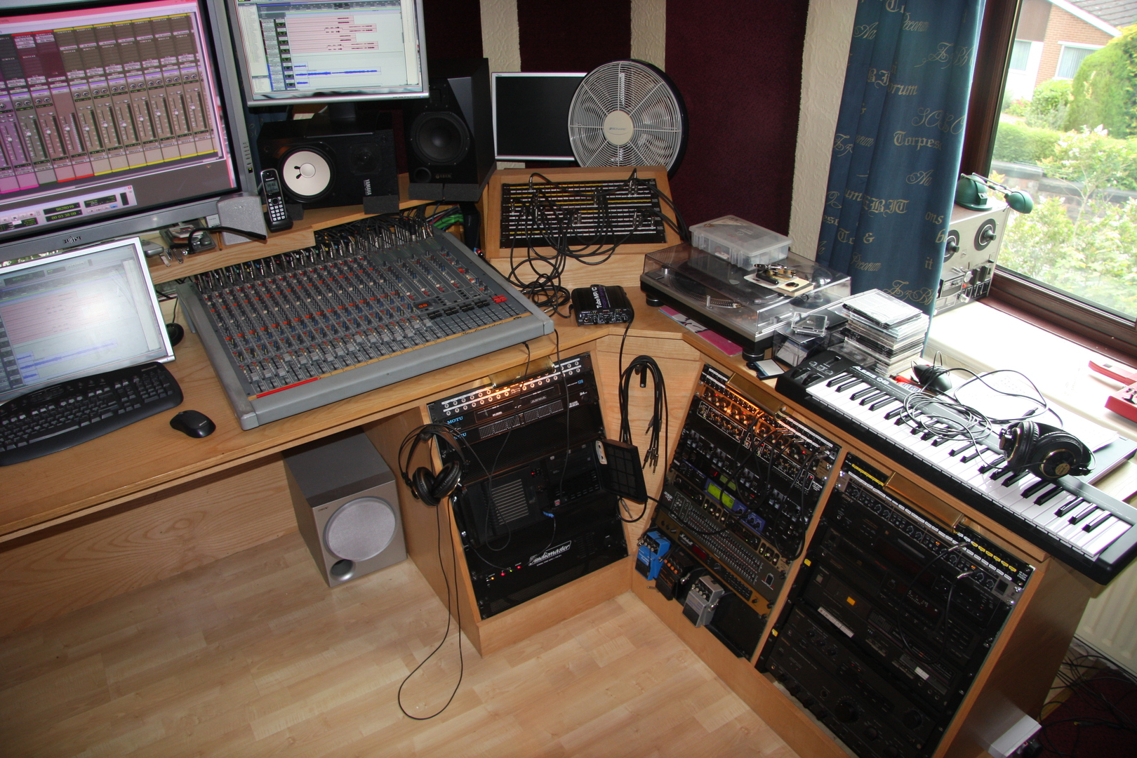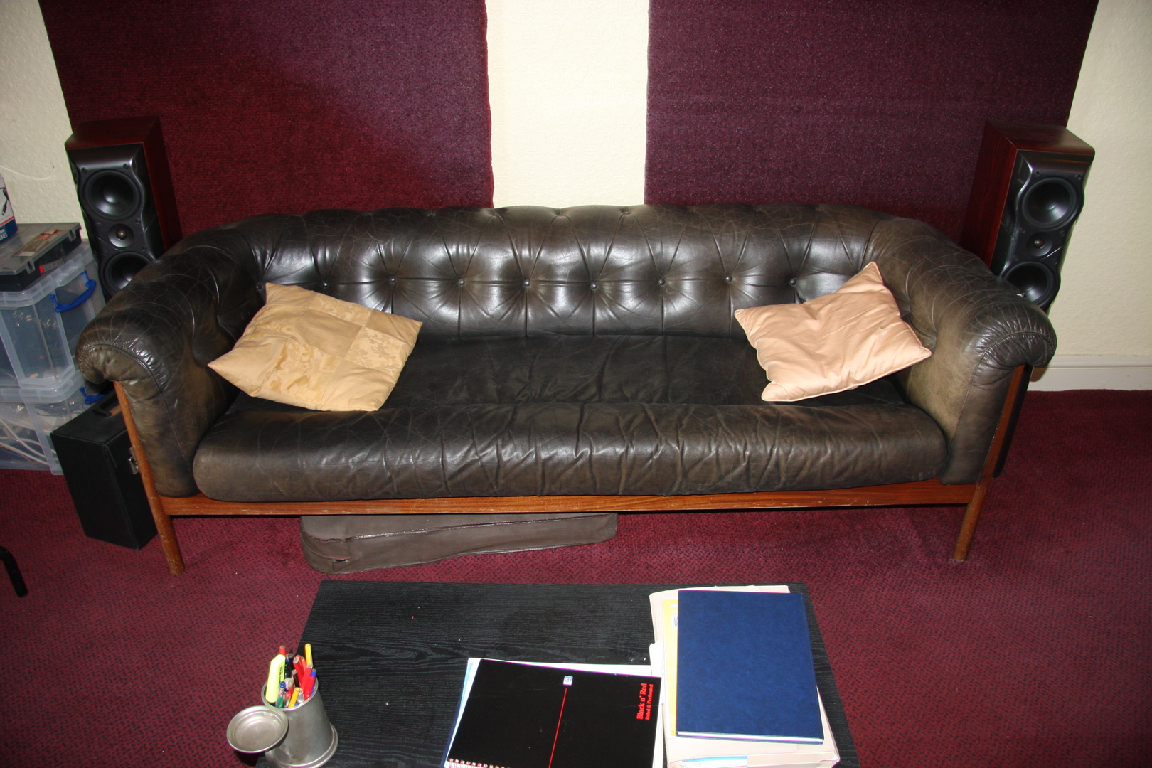 The 5m square control room houses the 2 mixing desks (one 16 channel analogue and one 16 channel control surface) all the outboard gear and of course the obligatory leather sofa.