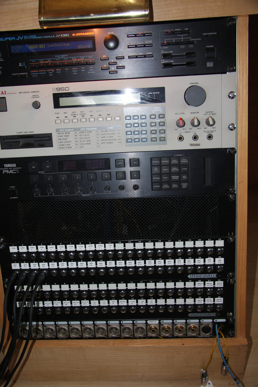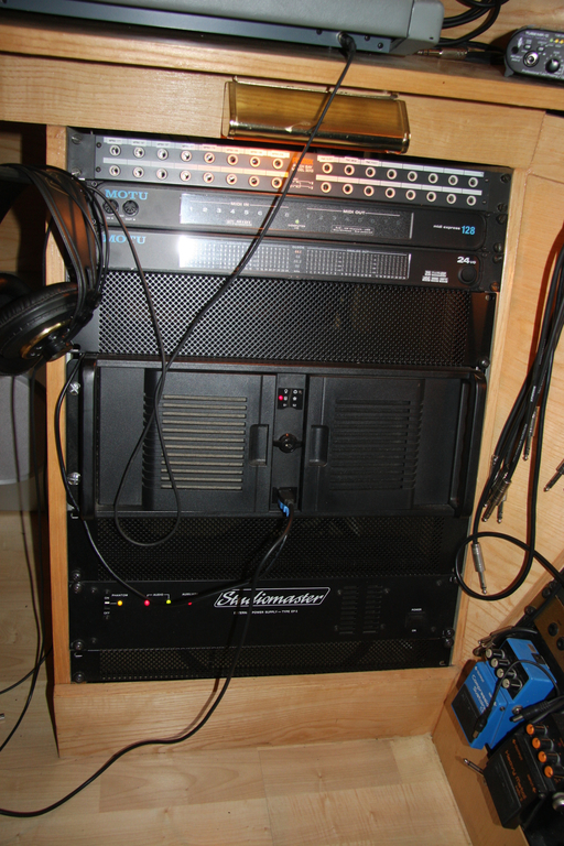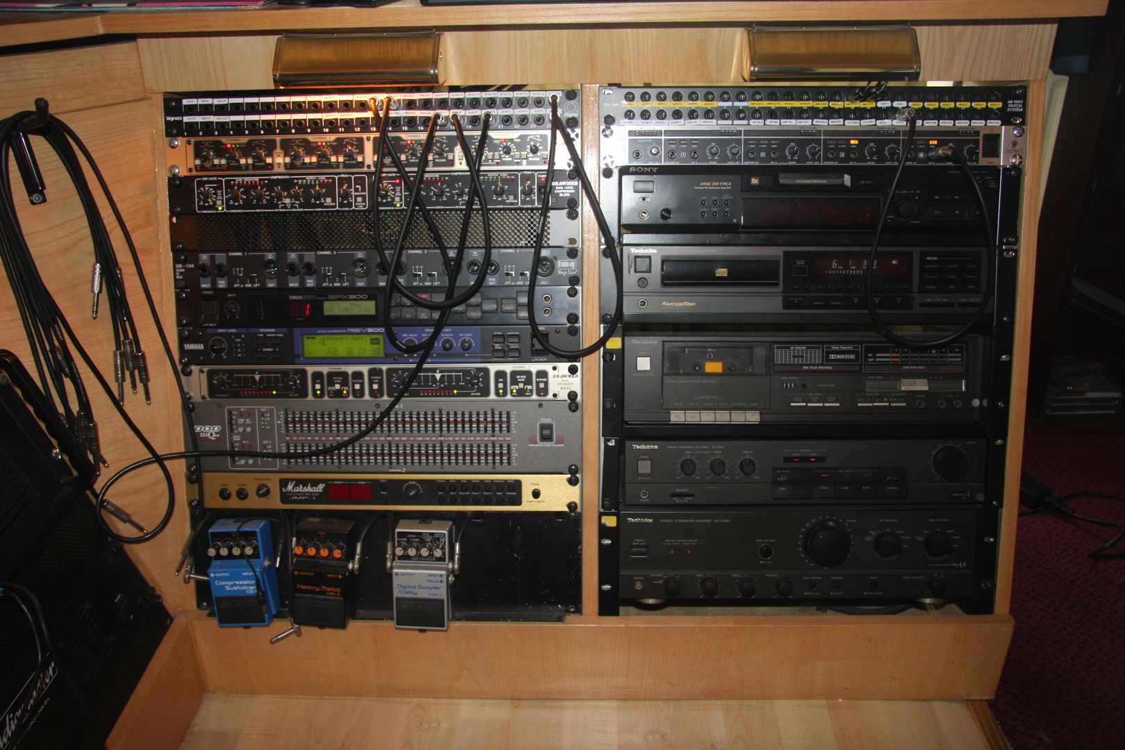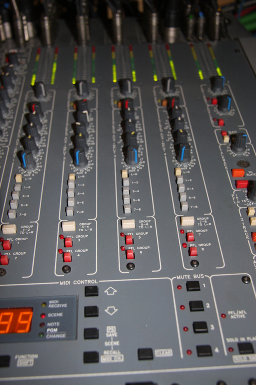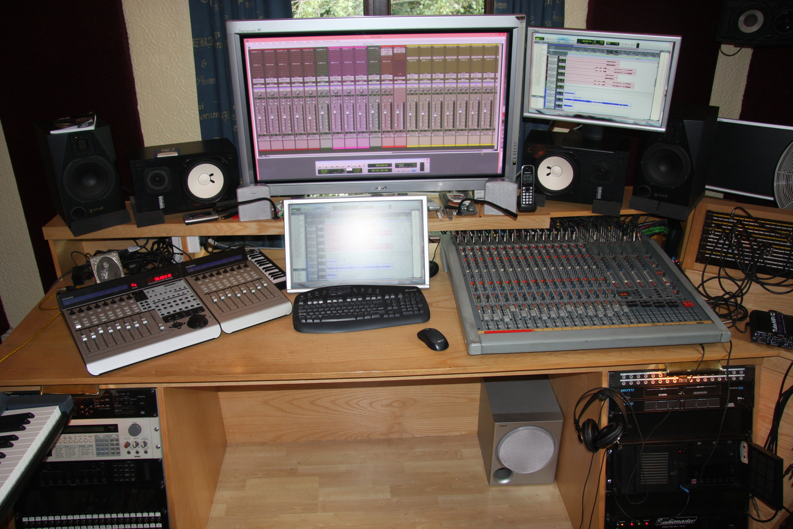 The 5m square control room houses the 2 mixing desks (one 16 channel analogue and one 16 channel control surface) all the outboard gear and of course the obligatory leather sofa.